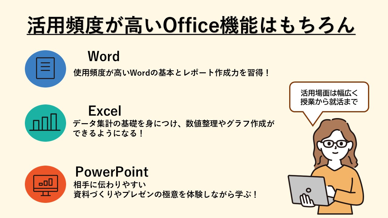 龍大生協オリジナルのパソコンスキル講座は「なんとなく過ぎる4年間」ではなく「充実して成長できる4年間/社会人になっても活かせる」をサポートする講座です。超初心者にも高校で少し使っていた人にもおすすめするパソコンスキル講座の特長はこちら!- 前期(6~7月頃)のレポート課題やプレゼン課題に活かせる内容は学業で活かせること間違いなし