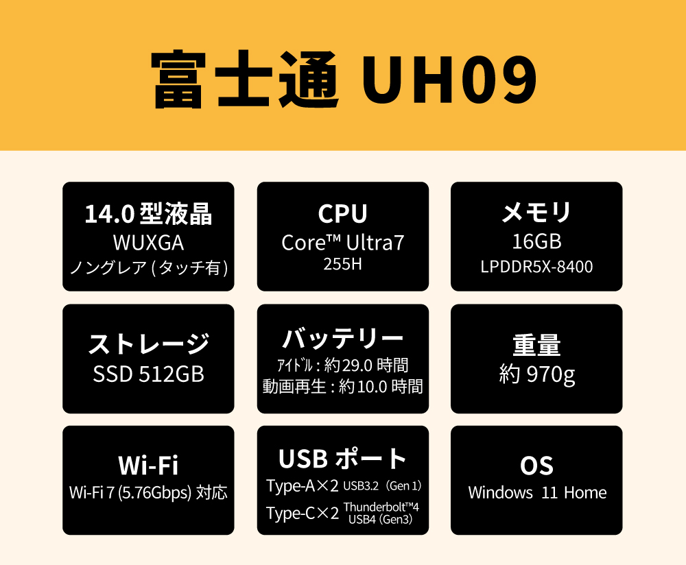 スタイリッシュで洗練されたデザインです。スペックはUH09やCXCと比べると劣りますが、学部によっては必要十分なスペックを用意しました。(※AI対応NPU非搭載モデルです。)