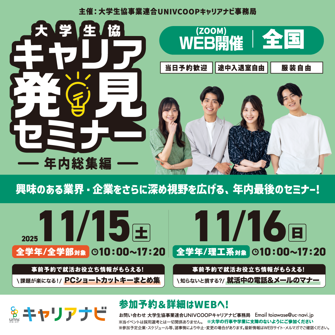 就活生の皆さんへお知らせ!年内最後の大学生協キャリア発見セミナーの開催が決定しました。今回はオンライン開催のため参加しやすいと思います。