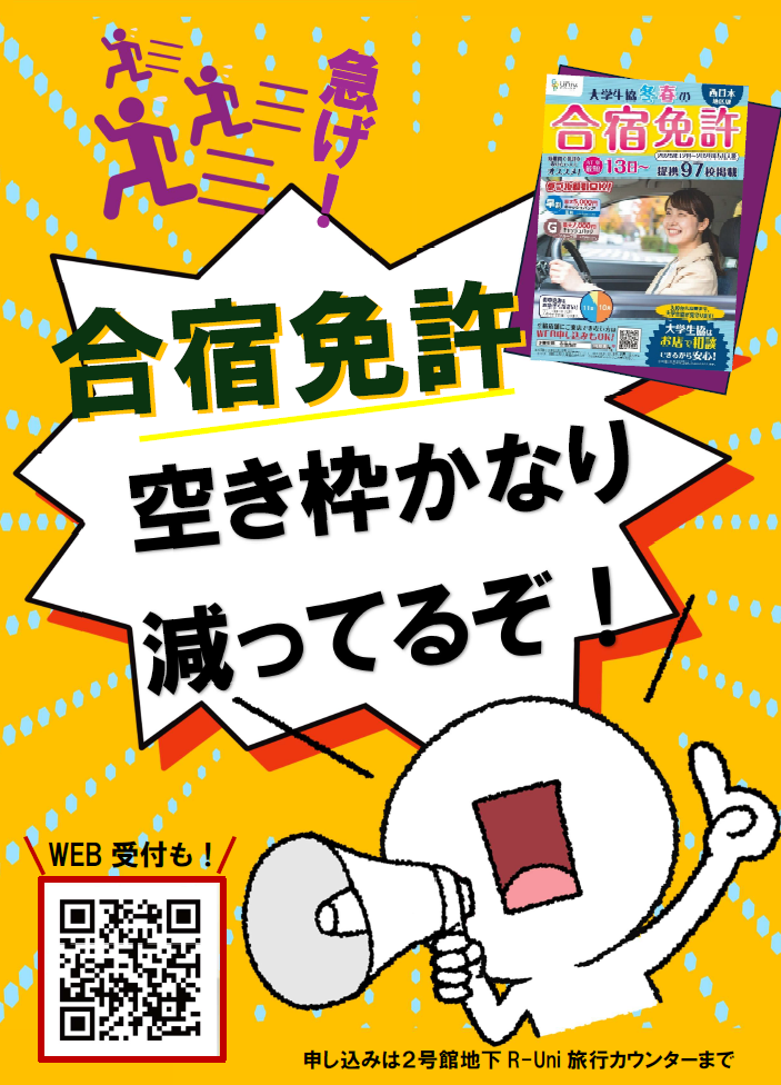 少しでも合宿教習について関心がある方は、10月27日(月)~30日(木)に生協店舗へご相談ください!