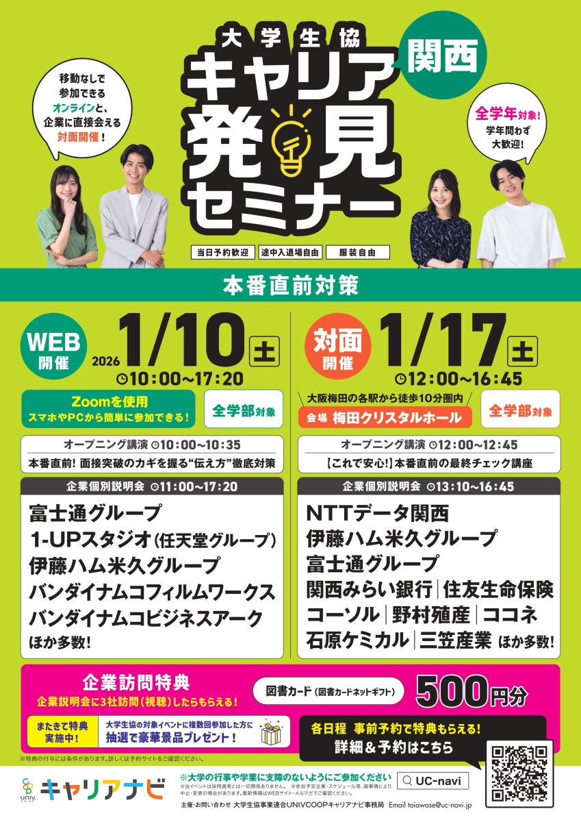 就活生の皆さんへお知らせ!本番直前対策として大学生協キャリア発見セミナーの開催が決定しました。