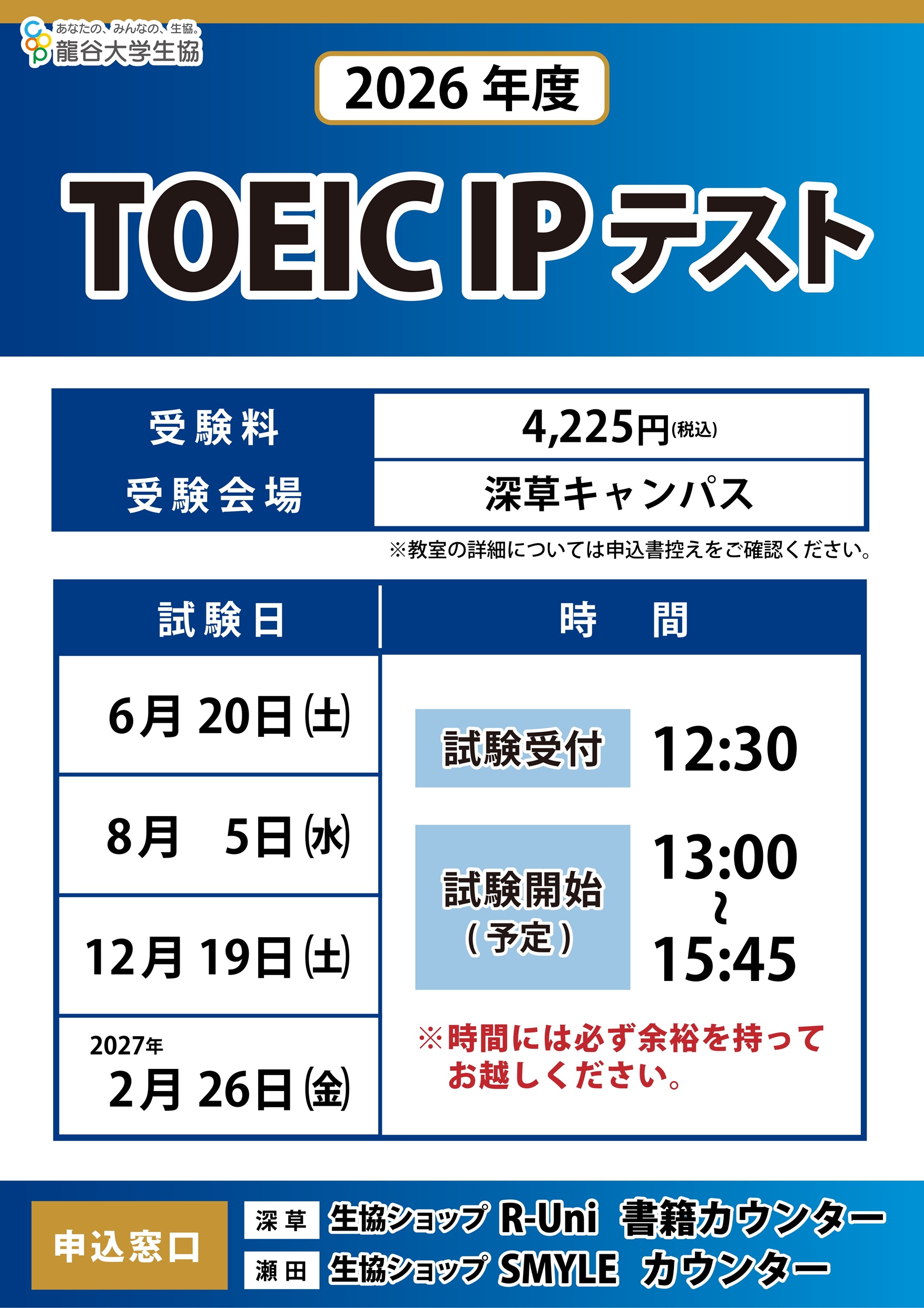※こちらでお申込できるのはTOEIC-IPテストです。TOEIC L&R公開テストではございませんので、ご注意ください。